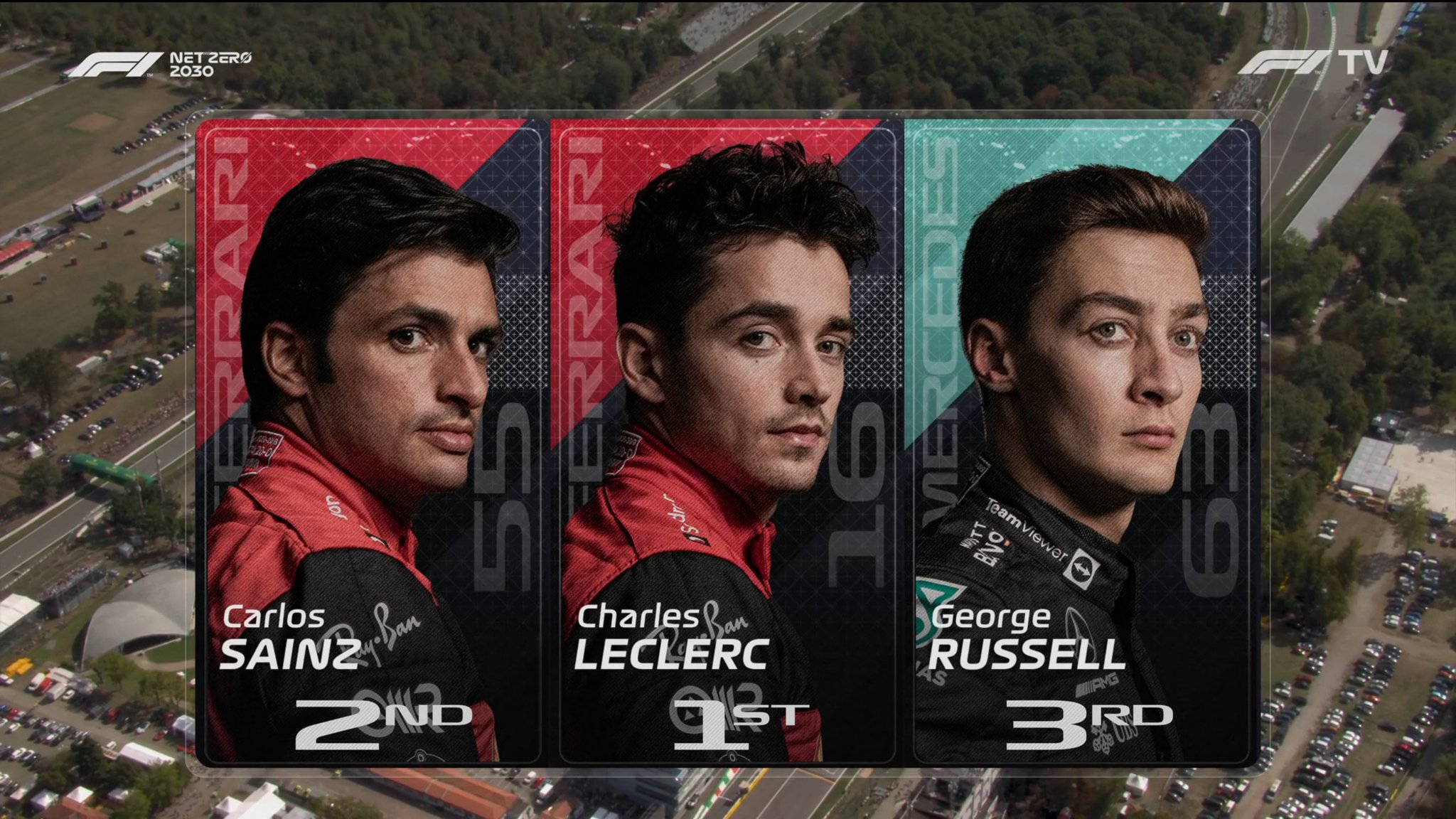 Tras los Ferrari, los Mercedes de RUSSELL y HAMILTON, con VERSTAPPEN a continuación pisándole los talones.
