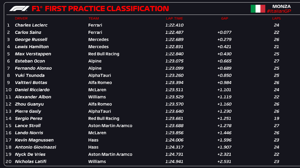 Los Ferrari comienzan el GP de casa en lo más alto de la clasificación, con Charles LECLERC primero y Carlos SAINZ segundo, a sólo 77 milésimas.
