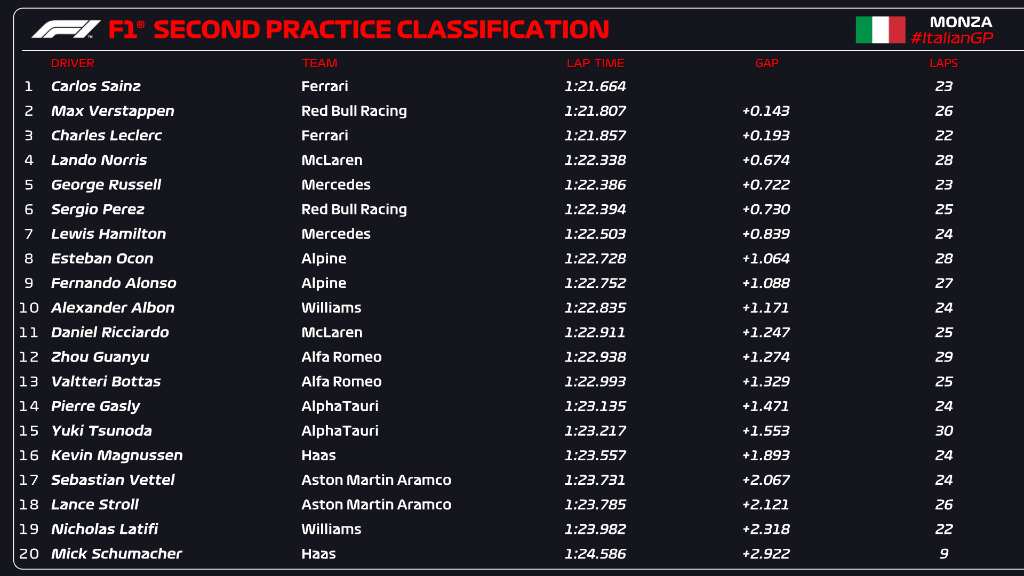 La segunda sesión termina de nuevo con los dos Ferrari en la parte superior de la clasificación, con Carlos SAINZ siendo el más rápido y LECLERC acabando a casi dos décimas en tercera posición.