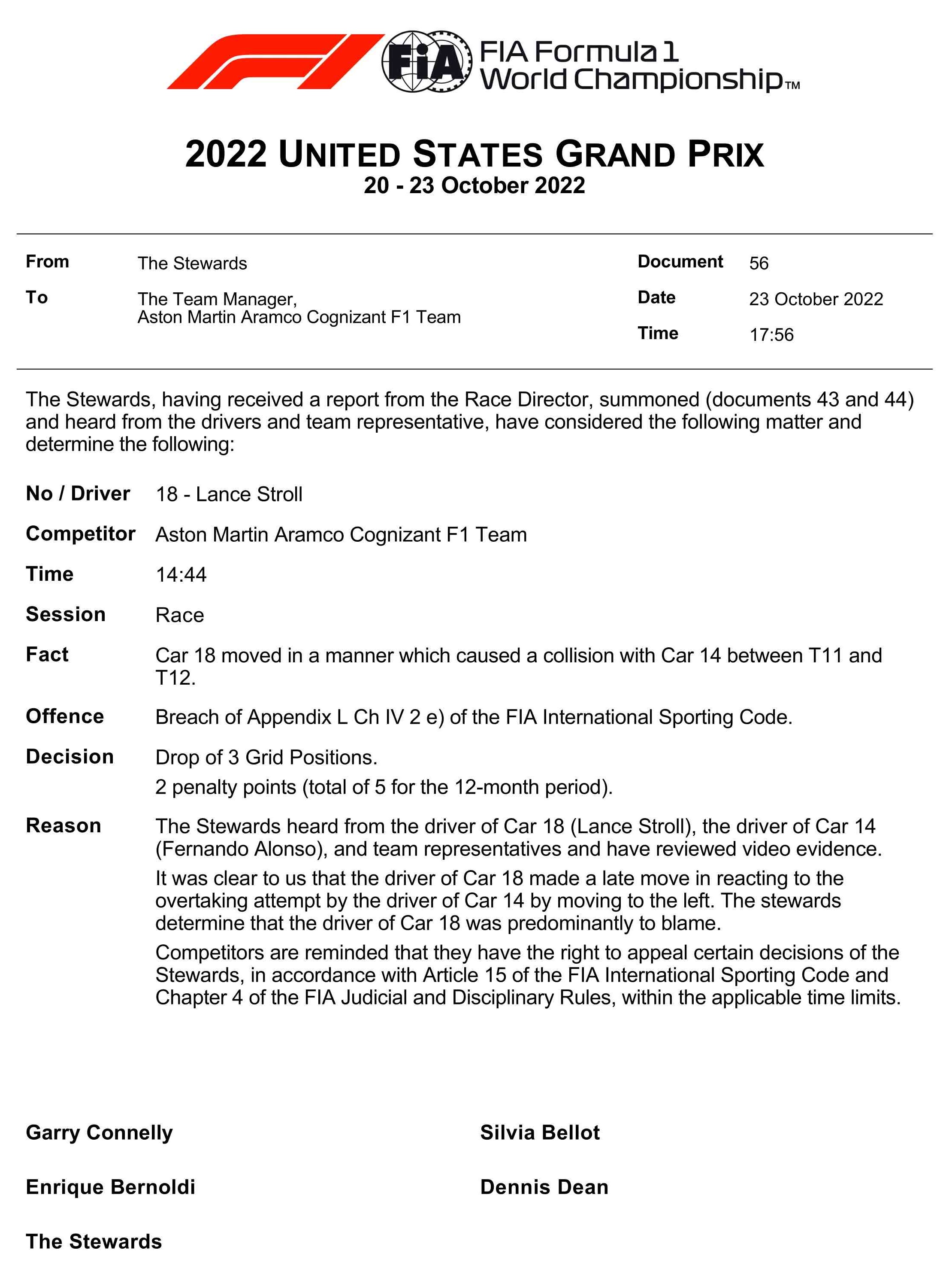 A Stroll le han caído 3 posiciones de sanción en la parrilla de México y 2 puntos de licencia por causar el accidente con Alonso.