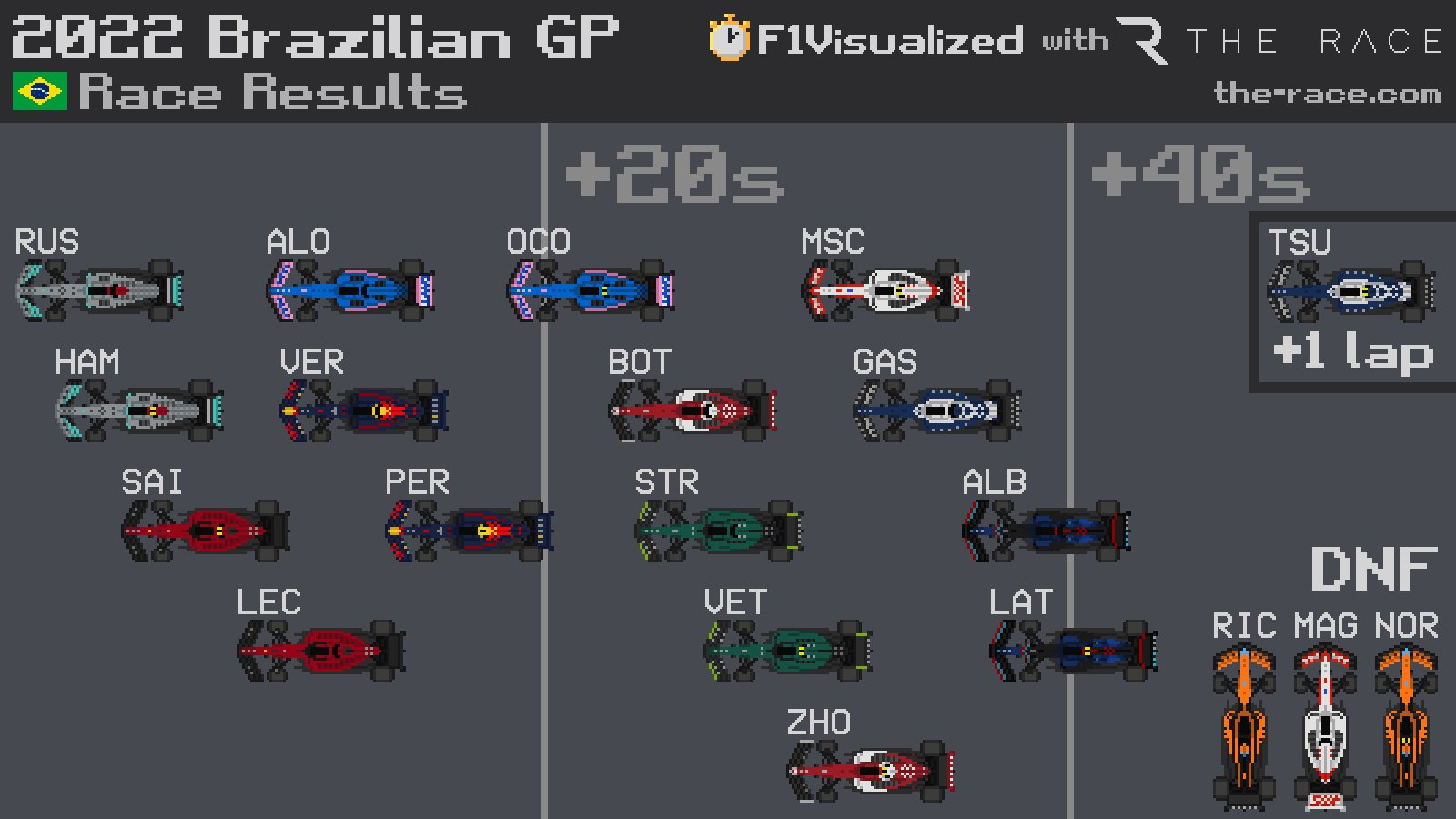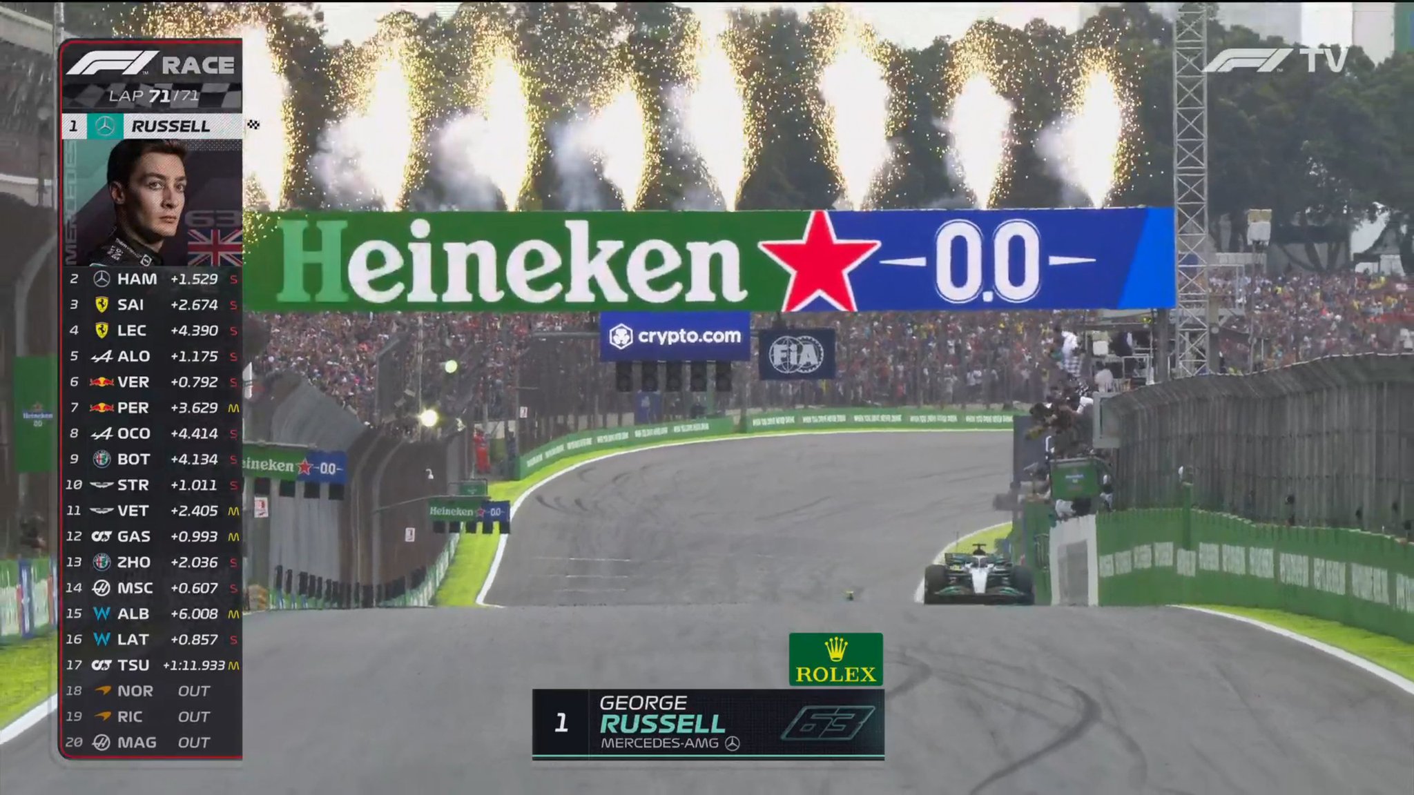 Gran victoria de George RUSSELL, que sale de Interlagos con la máxima cantidad de puntos posibles al marcar también la vuelta rápida y tras su victoria en la sprint de ayer. La de hoy sí que ese su primera victoria en la F1, la primera de Mercedes esta temporada. Muy emocionado. De cometer un error en calificación a ganarlo todo.