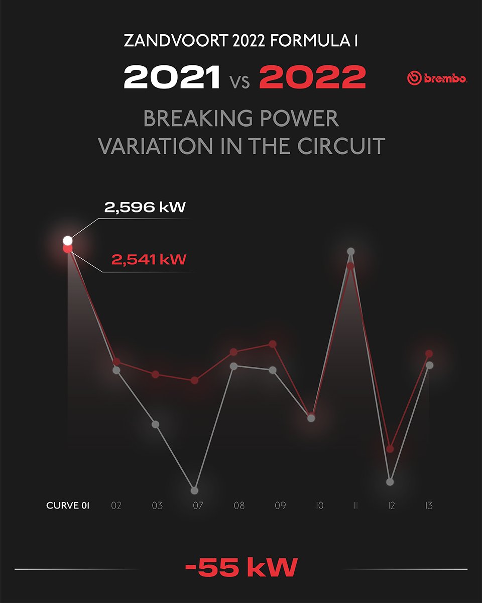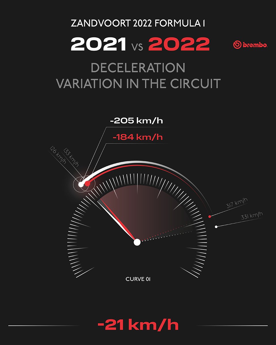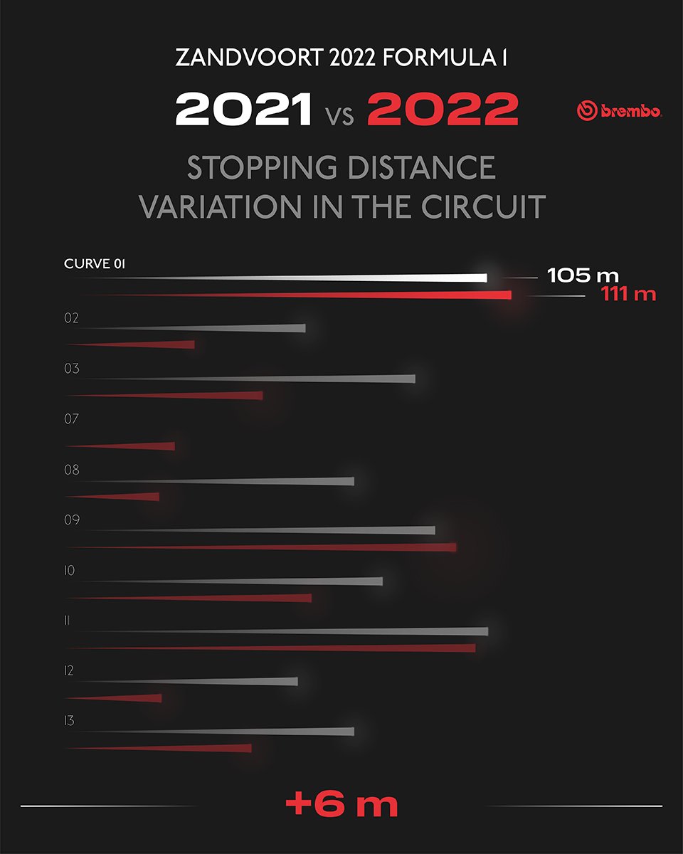 The most difficult braking section at the Dutch GP for the braking system is on the first turn because the cars  hit the brakes at 317 km/h (197 mph) and drop to 133 km/h (82.6 mph) in just 111 meters (364 feet).