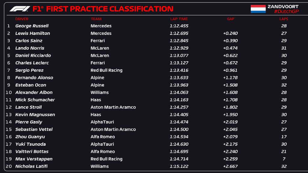 Los más rápidos en esta sesión han sido los Mercedes, con George RUSSELL quedando dos décimas por delante de HAMILTON.