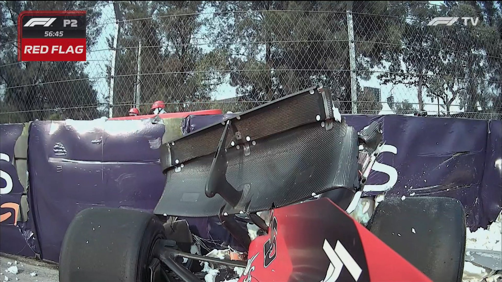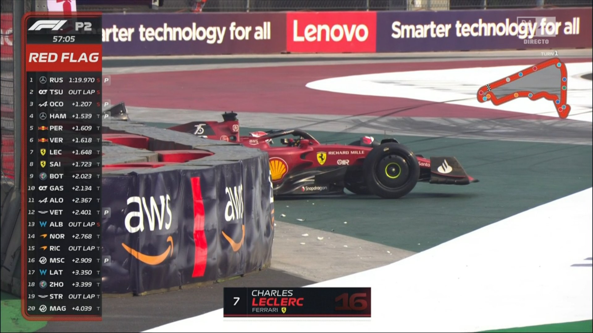 A poco de cumplirse la primera media hora de estos libres-test de Pirelli, bandera roja en pista por accidente de Leclerc.