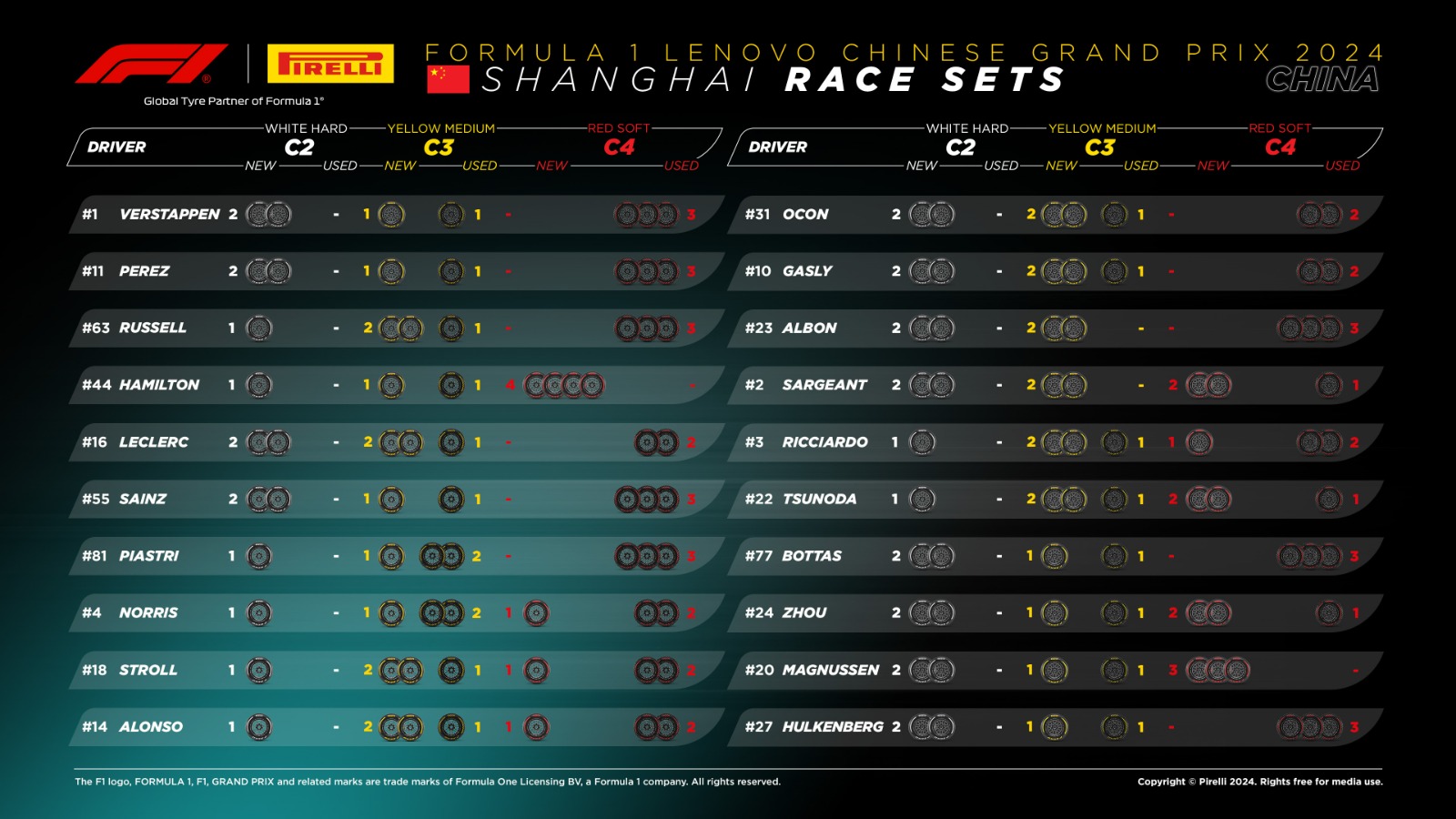 Estos son los juegos de neumáticos que tiene cada piloto.