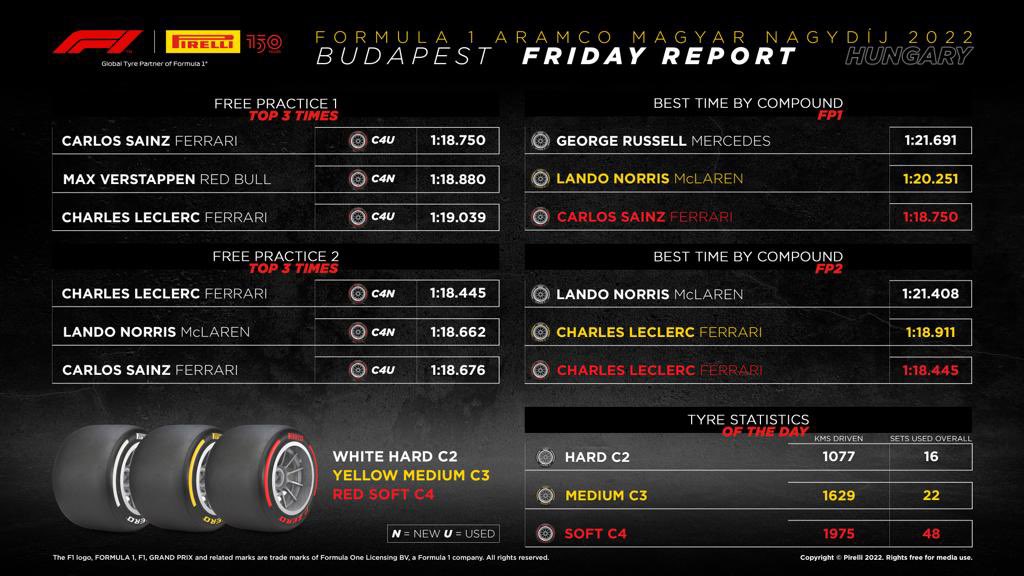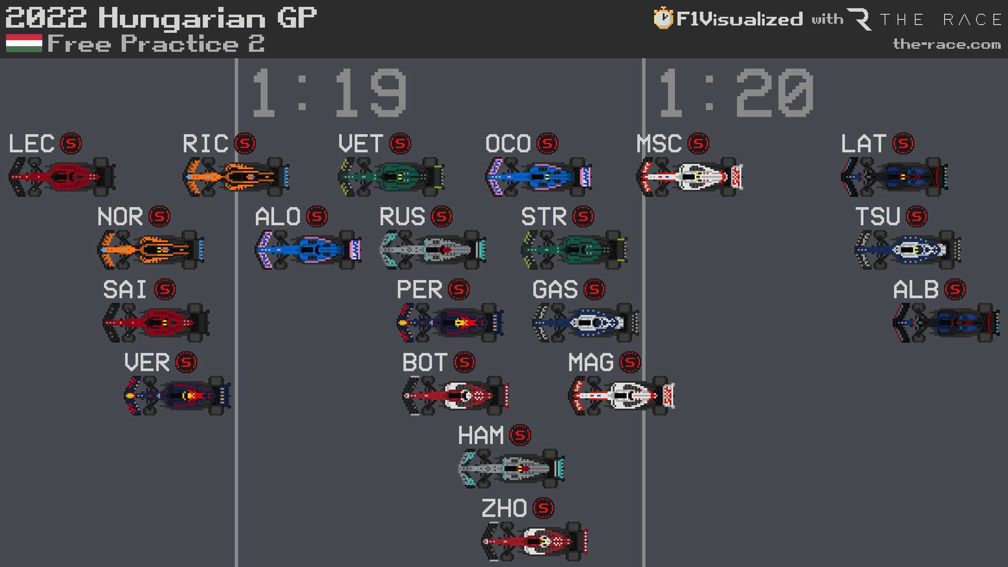 Según los tiempos en las tandas largas en los libres 2, así estarían los ritmos de cara a la carrera: los Ferrari serían los más rápidos seguidos de Red Bull y con los Alpine siendo los primeros del resto, por delante de McLaren.
