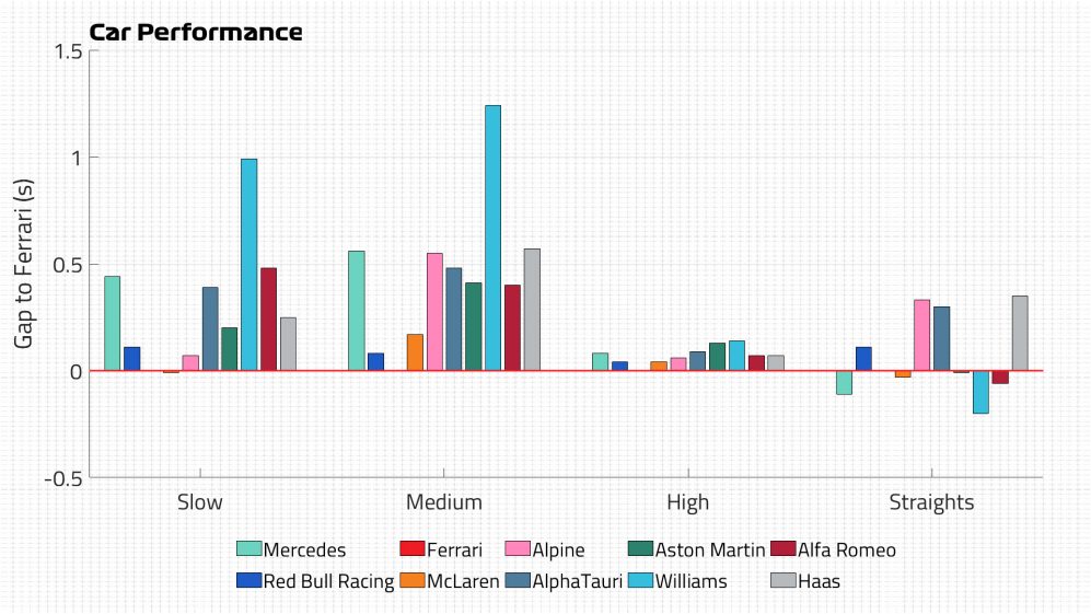 Tomando a Ferrari como referencia, estas serían las diferencias con los equipos en las distintas partes del circuito.