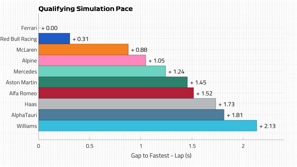 Viendo las simulaciones de calificación hechas durante los libres 2, Ferrari parece ser el más rápido, seguido de Red Bull.